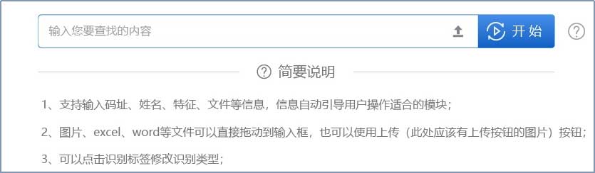 建設(shè)統(tǒng)一入口界面,實(shí)現(xiàn)用戶的多種輸入方式,包括但不限于各類碼址、名稱、地址、特征片段、數(shù)據(jù)文件、文檔文件等。支持通配符方式;支持中英文兩個(gè)語(yǔ)種的輸入支持和判斷,支持中英文混合輸入;支持多條信息或文件的輸入。